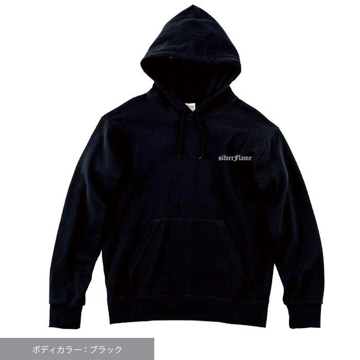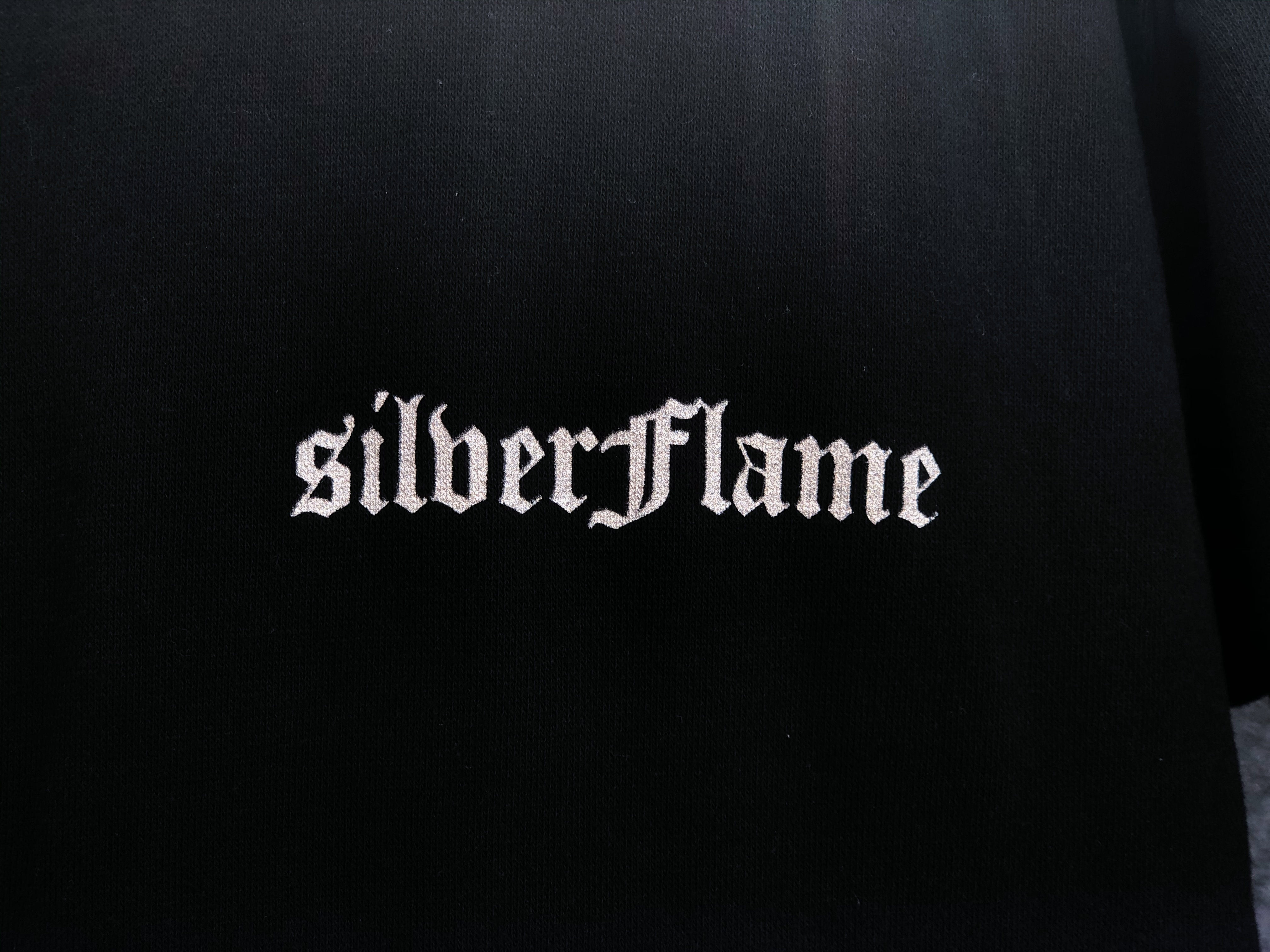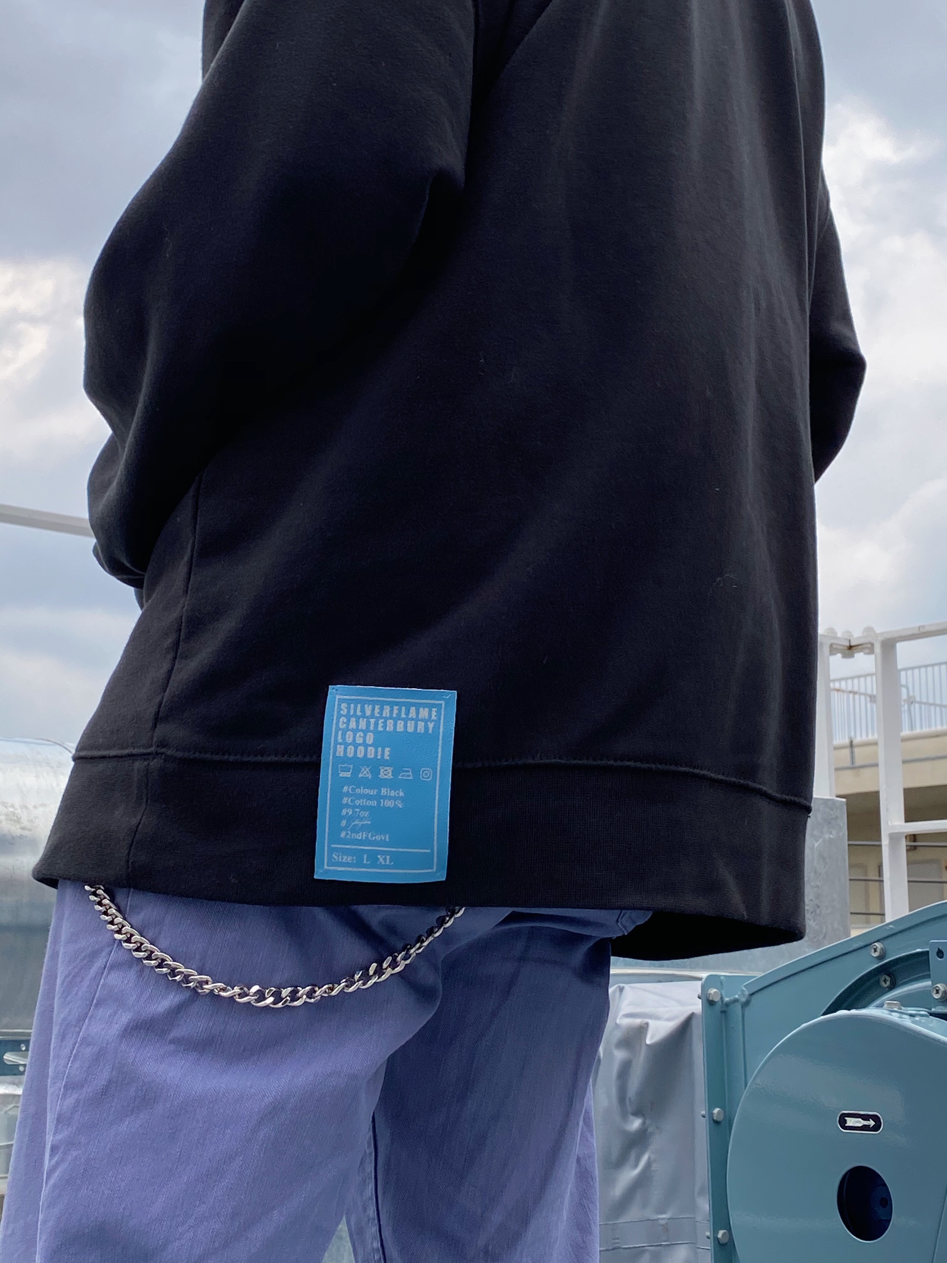 [Front design] 「silverflame」canterbury logo デザインプリント 銀インク使用 [Back design] オリジナルデザイン合皮タグ縫い付け [Body] 素材 綿100% 生地厚さ 9.7oz カラー ブラック サイズ L 身丈 73 身巾 59 肩巾 53 袖丈 63 XL 身丈 76 身巾 72 肩巾 58 袖丈 53